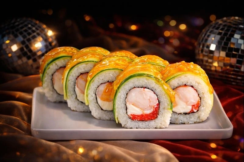 Состав: рис, нори, сыр, креветка, красная икра, огурец слайсы, соус манго-чили